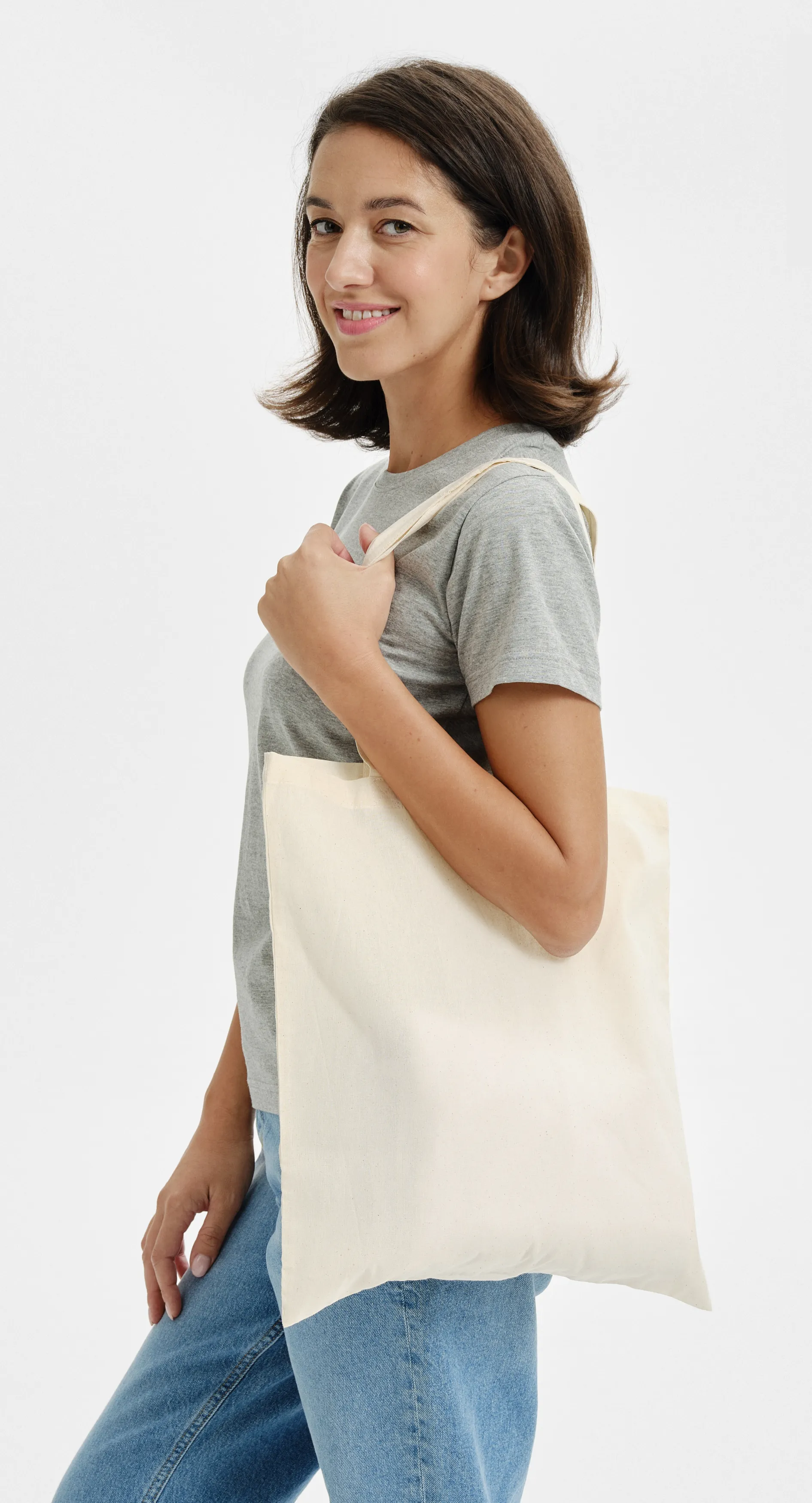 Käytännöllinen ja taitettava puuvillakassi, jossa on mahdollisuus kantaa sitä kädessä ja olkapään yli.