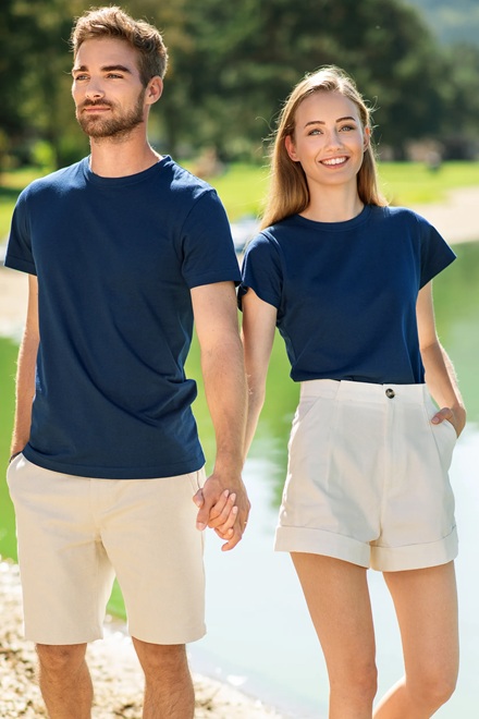 Puuvillainen T-paita naisille ja herrasmiehille, lyhyet hihat, pyöreä pääntie ja kontrastihelma.